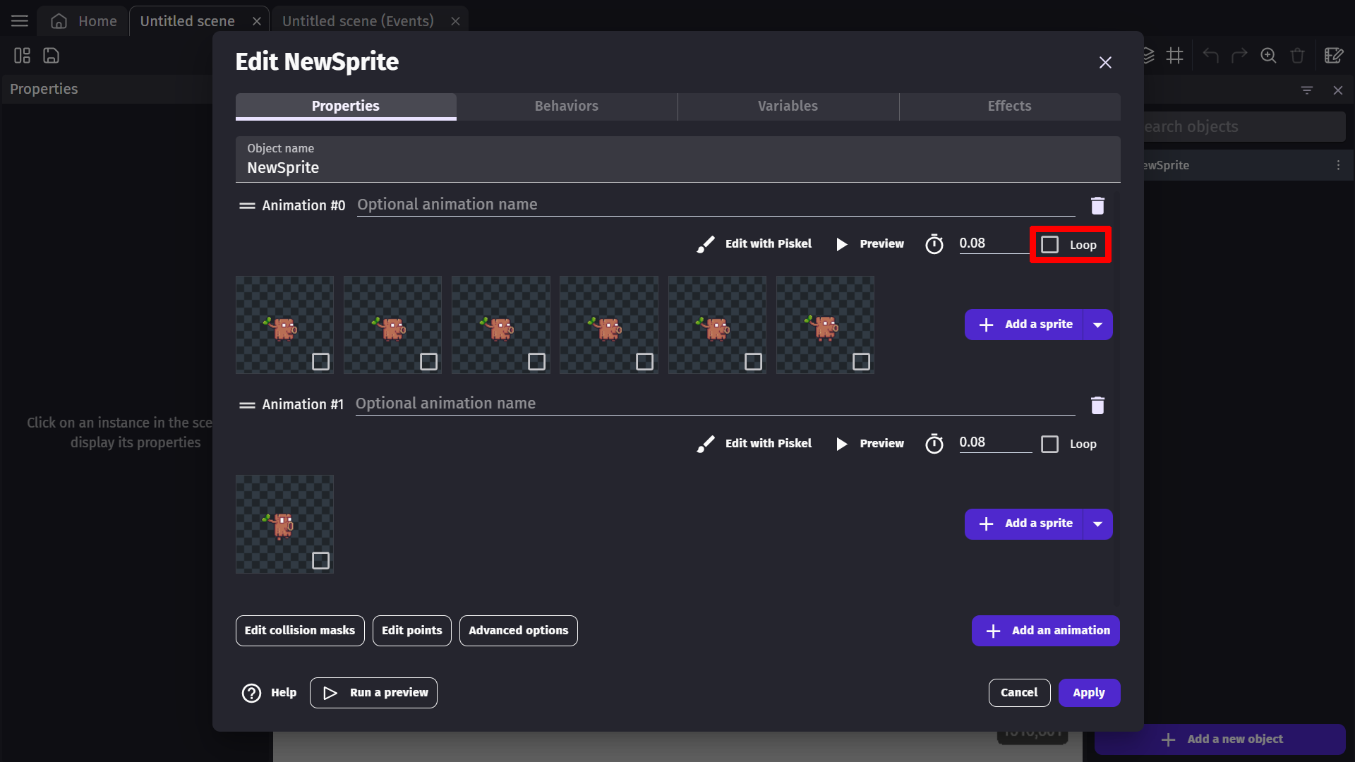 This selection will open up the sprite object properties window. In this window, you will see a few properties of the sprite object.