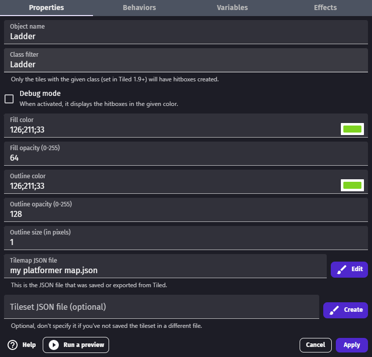 This object is meant for advanced users as it requires Tilemaps to be authored in an external editor: LDtk (Level Designer Toolkit) or Tiled. If you want to build a Tilemap directly inside GDevelop, prefer to use the integrated Tilemap object.