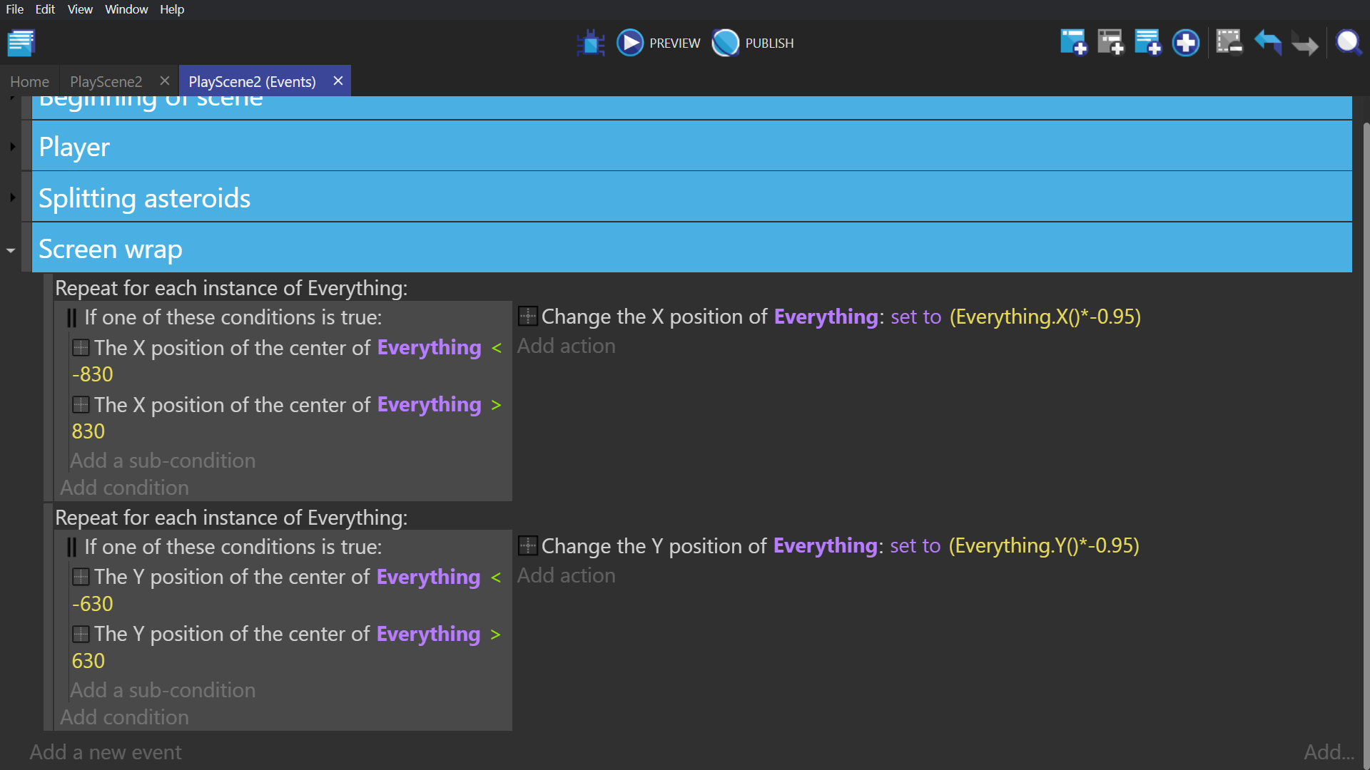 Condition: - "Or" which will allow you to add sub events, and if any of the subevents inside the "Or" condition is true, the "Or" condition will be true. With the subconditions: - "Center X position" of the object group "Everything" is "Greater than" 830. - "Center X position" of the object group "Everything" is "Less than" 830.