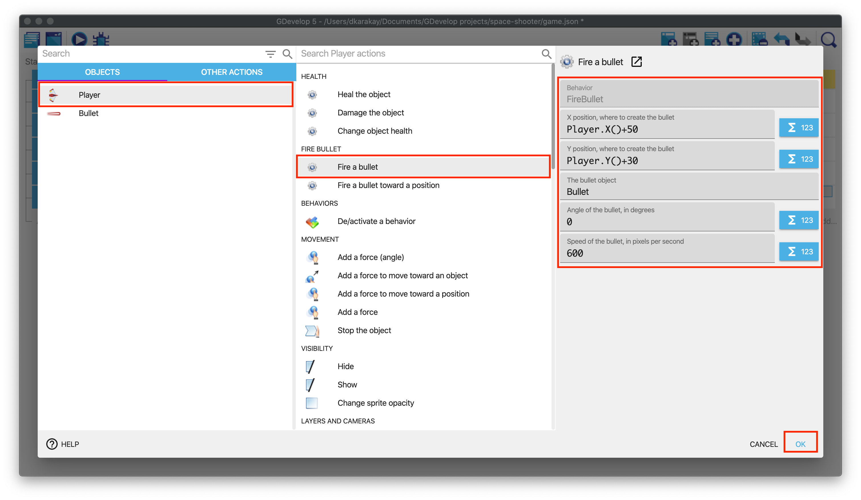 Player.X() is an expression that will be replaced by the position on the player's X-axis. We add 50 to position the bullet at the right of the object. The same goes for the Y-axis.
