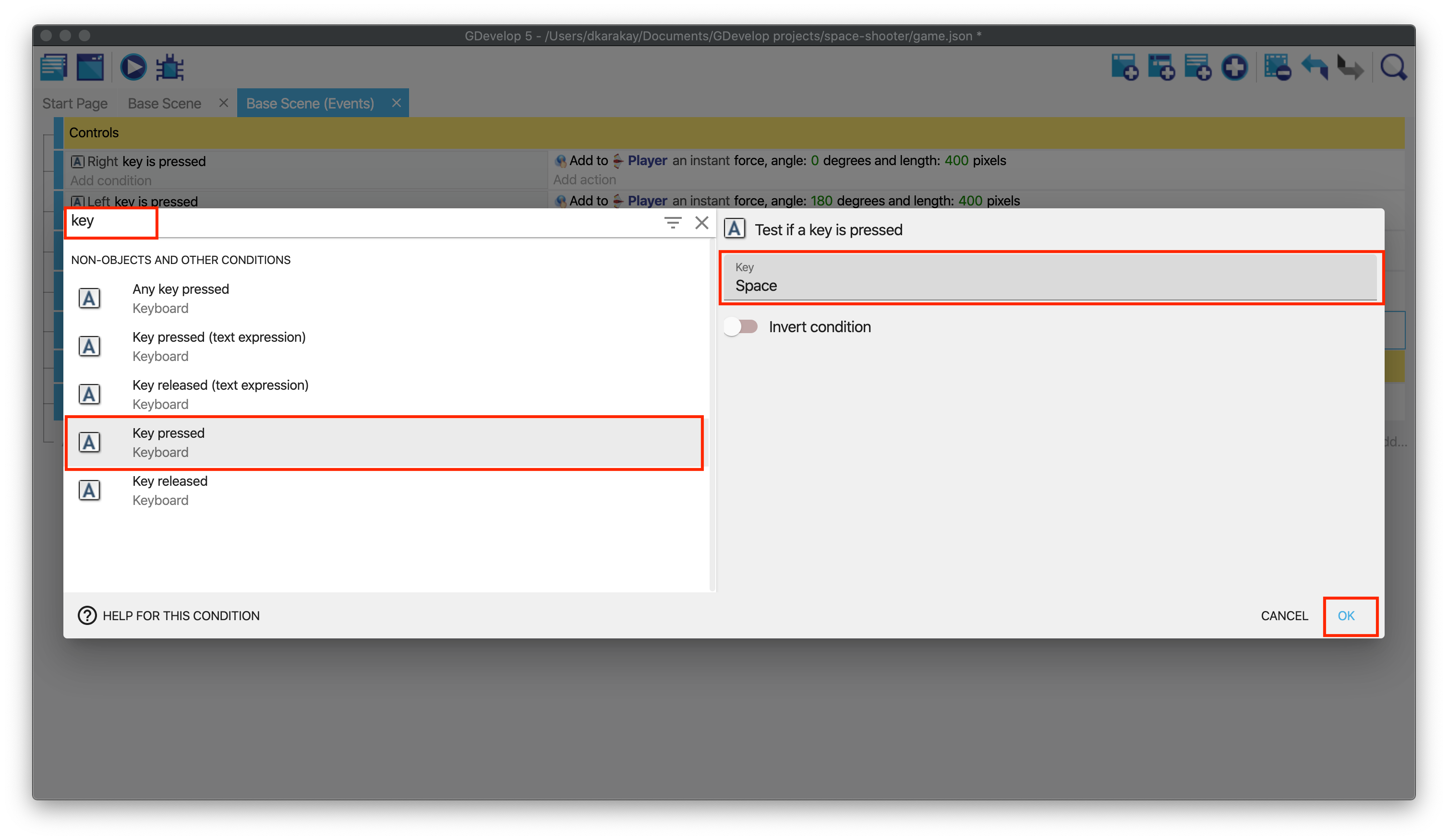 Then, open the Events page. Add a new event. Click on add a condition and type "key" to check whether the Space key is pressed or not.